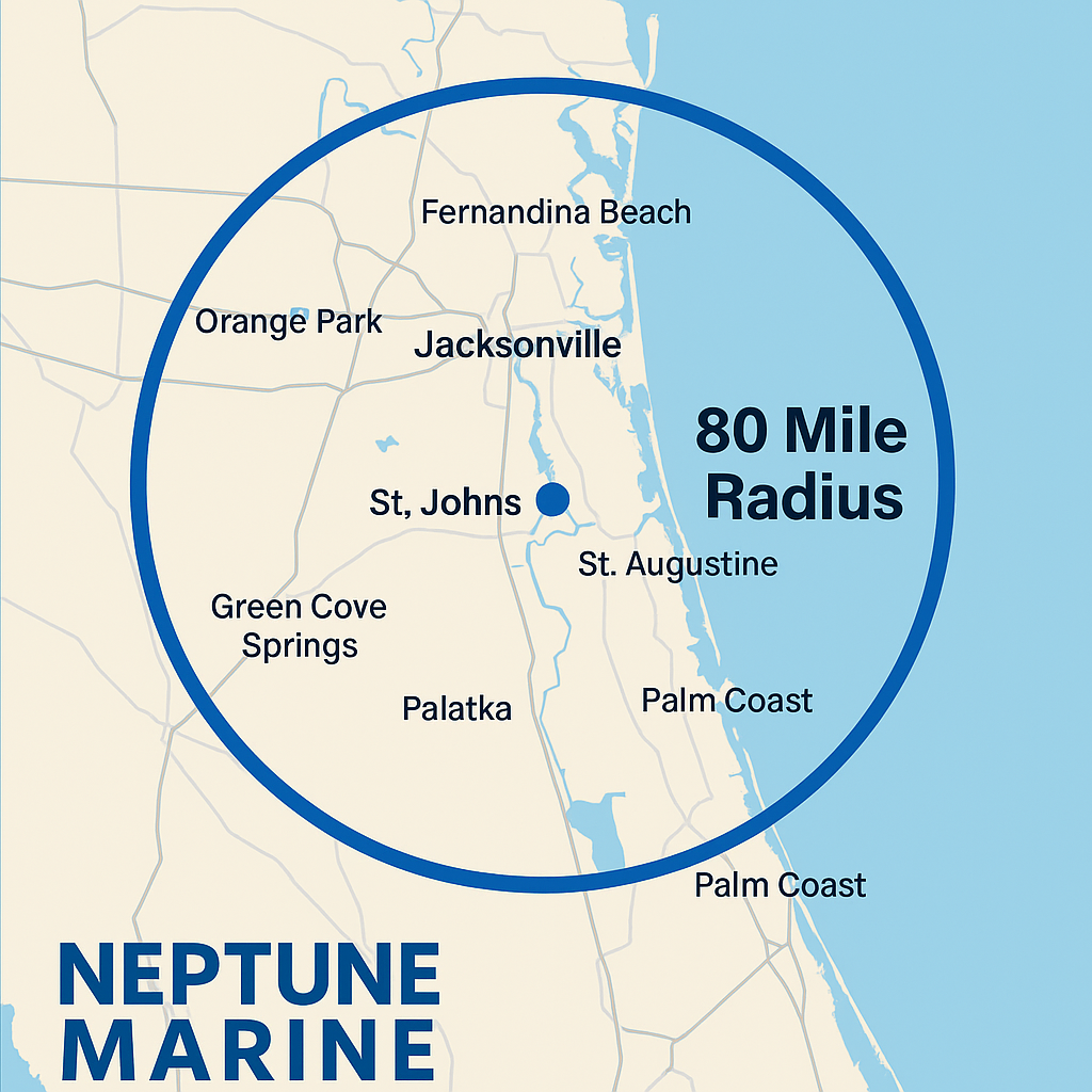 Boat owners in St. Augustine, Jacksonville, St. Johns, and surrounding coastal areas face unique challenges due to saltwater, heat, humidity, and heavy seasonal use. Neptune Marine Service specializes in solving these exact issues: